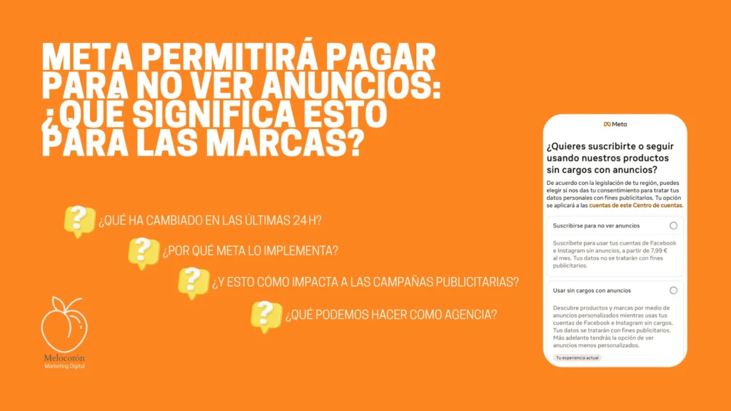 Todo acerca del nuevo modelo de Meta Ads en Europa 1. ¿Qué ha cambiado en las últimas 24 h? Meta ya ofrece en Europa la opción de suscribirse para dejar de ver anuncios en Facebook e Instagram. Lo novedoso es que ahora llega con precios reducidos: unos 5,99 € en web y 7,99 € en iOS/Android por cuenta […]